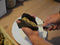 placez le gant sur votre main gauche, vous tiendrez le couteau de la main droite (inverse pour les gaucher)