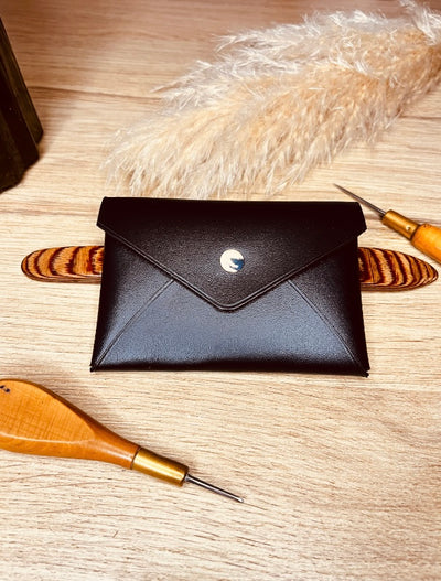 Pochette intemporelle en cuir pleine fleur de haute qualité, confectionnée à la main de manière artisanale, avec une finition raffinée qui lui confère une élégance soignée.