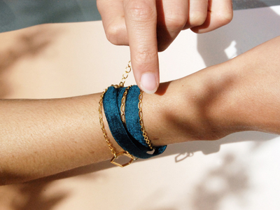 - Bracelet réglable en soie, pendant et chaîne laiton doré à l'or fin 24k