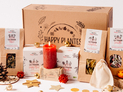 Nos tisanes Happy Noël et Intemprelles seront aussi présente en infusettes compostables. Le tout est ensuite emballé dans notre box fleurie Happy Plantes accompagné de jolies fleurs séchées : des têtes d'immortelles produites en Auvergne au bord de l'Allier.