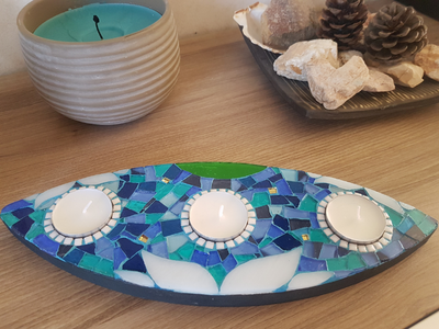 Entièrement designé et fabriqué à la main par une créatrice artiste mosaïste du Sud-Ouest de la France.