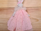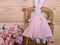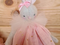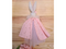 Le corps du lapin est en feutrine et rembourre de fibre polyester. Le tissu employé est un double gaze de coton perlé de doré. Jupon et collerette sont en tulle blanc fin et souple. Un petit ruban de satin rose peaufine la tenue de Lili.