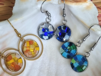 Chaque pendentif est composé d’une constellation de minuscules bouts de verre vitrail qui miroitent avec la lumière et est attaché à un cordon noir.