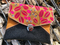 Confection réalisée avec un simili suédine et tissus de marque française. Pièce unique.